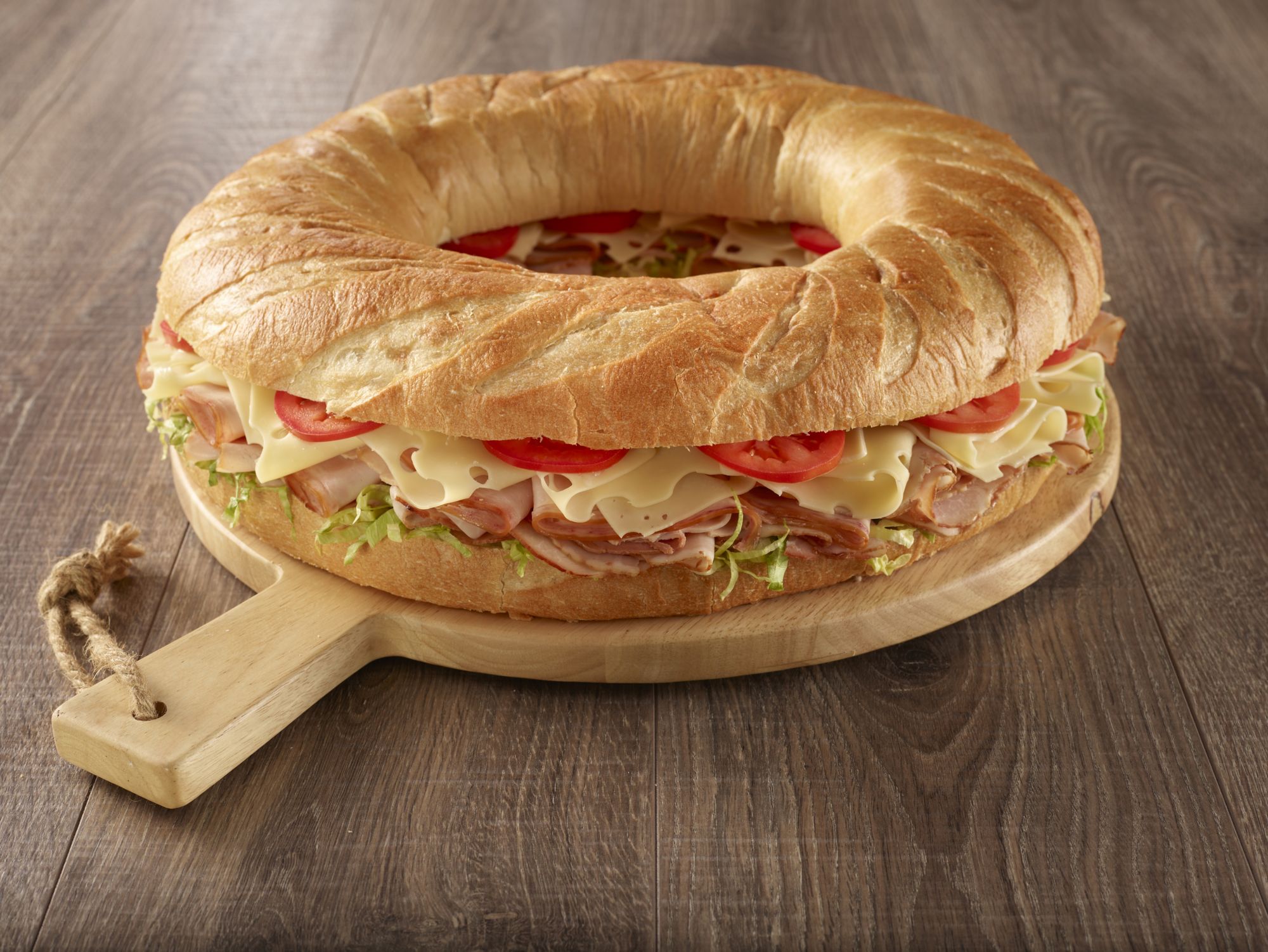 Wellsley Farms Deli Sandwich Ring - BJs Wholesale Club Make an impact at your next party with the Wellsley Farms Deli Sandwich Ring. Not only does it stand out on the table, but it tastes good, too. It features both honey ham and smoked turkey breast and comes with Swiss cheese, lettuce and sliced tomatoes. In total, the ring typically serves about 12 to 15 people.
